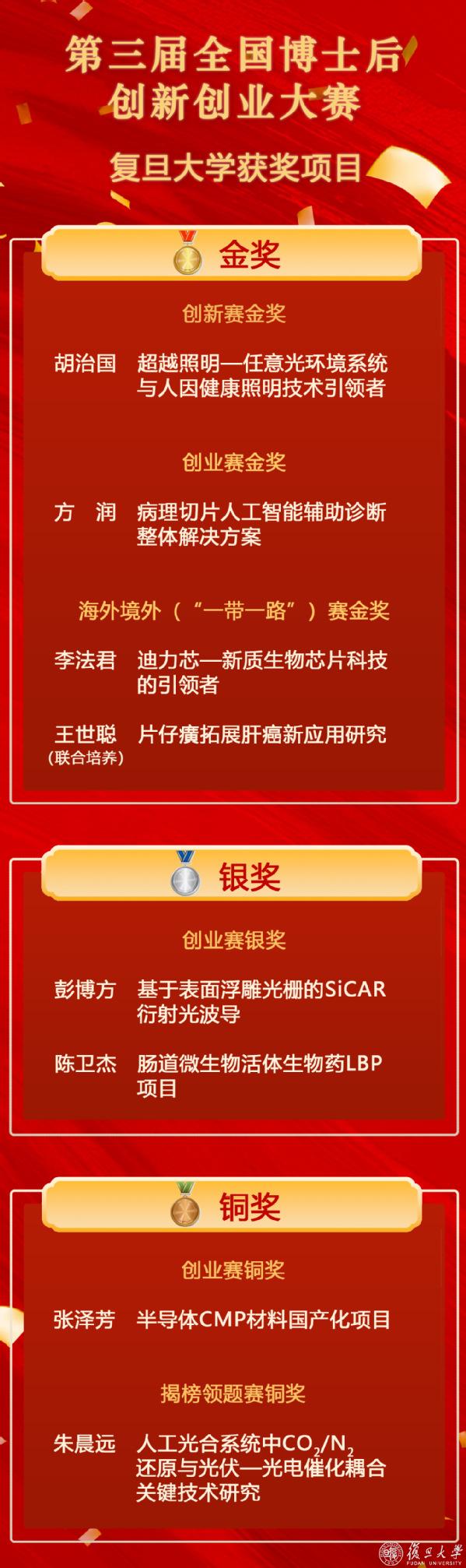 作为规模最大、层次最高、覆盖面最广的全国性博士后创新创业赛事,复旦参赛团队在本次大赛中的表现生动诠释了复旦博士后立足学术潮头、勇闯科技新路的时代风采。祝贺以上获奖者!