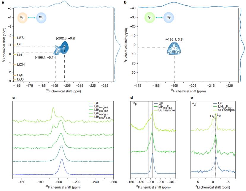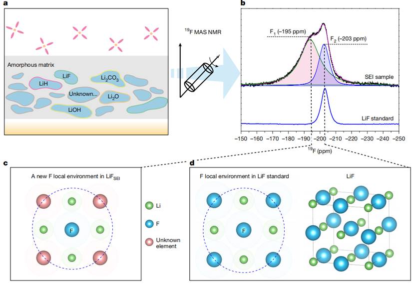 团队通过固态NMR技术对Cu||LiFePO4电池负极的SEI进行表征,首次发现传统意义上归属于LiF*的信号由两个亚峰组成:F1(195 ppm)和F2(203 ppm)。其中F2与纯LiF化学位移一致,而F1此前未见报道,意味着SEI中存在不同于纯LiF的化学环境。