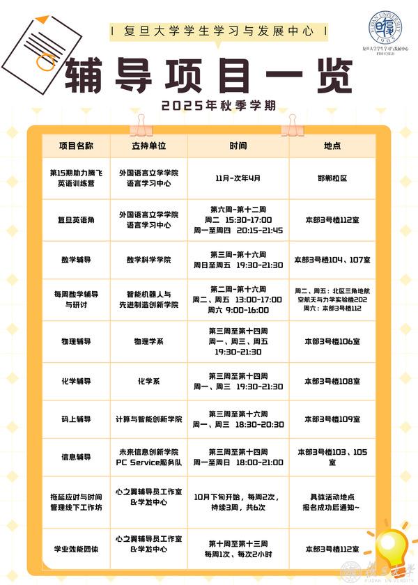 为助力学生夯实基础课程,学发中心联合数学科学学院、外国语言文学学院、物理学系、化学系、计算与智能创新学院、未来信息创新学院等院系,汇聚各专业优秀学长学姐,打造一批助力促进学业的项目,构建起可持续的朋辈助学生态。除了英语角、“数院大神”辅导外,还有“物理大神”“化学大神”“PC Service服务站”“码上辅导”“助力腾飞英语训练营”等多元项目,以“分层辅导、精准破题”为核心,在第一课堂之外帮同学们扎稳根基。