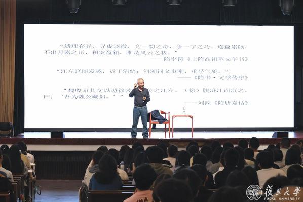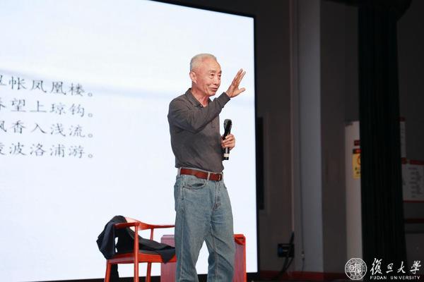 11月7日,雨,复旦大学相辉堂南堂人头攒动,座无虚席。只见台上一位精神矍铄的老者,身着T恤加牛仔裤,声如洪钟,气势磅礴地朗诵起李白的《将进酒》。