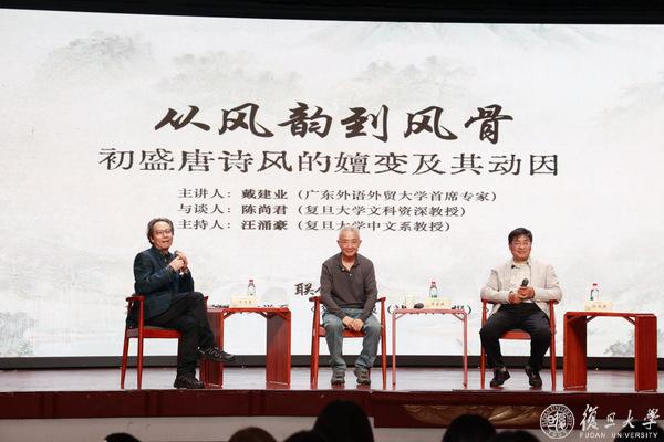 戴建业教授此次来复旦,是受邀参加《古代形式批评理论类编》丛书发布会,并带来讲座“从风韵到风骨:初盛唐诗风的嬗变”。作为古代文学研究大家,他不仅出版《澄明之境——陶渊明新论》《论中国古代的知识分类与典籍分类》《诗囚:孟郊论稿》《文本阐释的内与外》《两宋诗词简史》《六朝文学史》等学术著作,还凭借风趣幽默、深入浅出的诗歌讲解,在互联网圈粉无数,成为坐拥千万粉丝的“国民教授”。