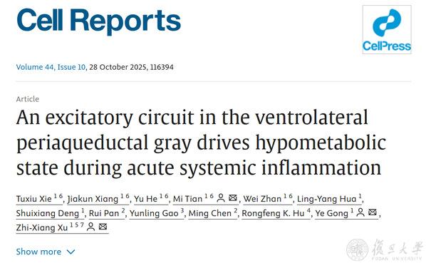 2025年10月28日,复旦大学脑科学研究院/脑功能与脑疾病全国重点实验室许智祥课题组联合附属华山医院重症医学科宫晔团队,在《细胞报告》(Cell Reports)发表了题为“中脑导水管腹外侧区的兴奋性神经环路驱动急性系统性炎症诱导的低代谢状态(An excitatory circuit in the ventrolateral periaqueductal gray drives hypometabolic state during acute systemic inflammation)”的研究论文,发现位于中脑导水管腹外侧区(vlPAG)至延髓孤束核(NTS)的一条兴奋性环路在系统性炎症诱导低代谢状态中发挥关键作用。
