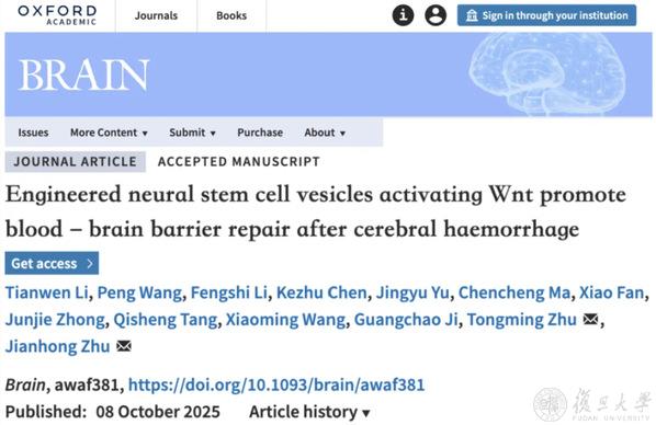 2025年10月8日,复旦大学附属华山医院神经外科朱剑虹团队在《脑:神经病学杂志》(Brain) 在线发表了题为“工程化神经干细胞囊泡通过激活Wnt促进脑出血后血脑屏障修复(Engineered neural stem cell vesicles activating Wnt promote blood - brain barrier repair after cerebral haemorrhage)”的论文,展示了在神经修复治疗领域的研究成果。该研究基于团队在神经干细胞领域近二十年积累,利用自主研制的神经干细胞来源的细胞外囊泡作为载体,研发出能够精准靶向并修复血脑屏障的模块化“智能囊泡”(EVs-WK),是团队推动神经干细胞基础研究向临床治疗转化的又一突破。
