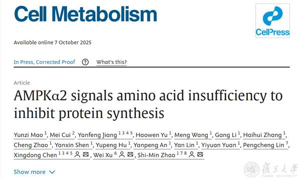 2025年10月7日,复旦大学附属妇产科医院赵世民、徐薇联合复旦大学人类表型组研究院陈兴栋团队在国际代谢领域期刊《细胞-代谢》(Cell Metabolism)发表了题为“AMPKα2 Signals Amino Acid Insufficiency to Inhibit Protein Synthesis”的研究成果。该研究首次揭示,AMPKα2能够作为大脑“氨基酸丰度的感应器”,抑制蛋白质过度合成。这一发现表明,大脑中氨基酸与蛋白质代谢的失衡是导致病理蛋白聚集的重要诱因,促进神经退行性病变。未来,靶向AMPKα2有望成为阿尔茨海默症(Alzheimer’s Disease, AD)防治的新策略。
