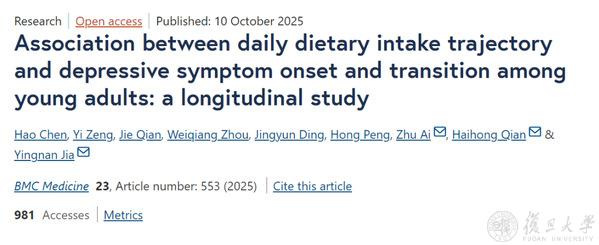 2025年10月10日,复旦大学公共卫生学院贾英男、陈浩课题组在《BMC-医学》(BMC Medicine)上发表了题为“Association between Daily Dietary Intake Trajectory and Depressive Symptom Onset and Transition among Young Adults: A Longitudinal Study”的研究论文,在膳食摄入数字监测与心理健康领域取得重要进展。该团队利用校园智能点餐系统大数据,首次描绘了青年群体长期膳食摄入轨迹与抑郁症状发生及转变的关联图谱。