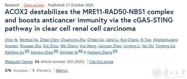 2025年10月21日,复旦大学附属华东医院泌尿外科张海梁团队近日在《分子癌症》(Molecular Cancer)上发表题为“ACOX2 destabilizes the MRE11-RAD50-NBS1 complex and boosts anticancer immunity via the cGAS-STING pathway in clear cell renal cell carcinoma”的论文。该研究首次揭示了ACOX2在ccRCC中的抑癌作用及非代谢调控机制,为晚期ccRCC患者接受PARPi、ICI及两者联合治疗提供了有潜力的生物标志物。