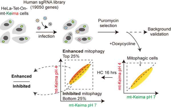 HC诱导的线粒体自噬全基因组CRISPR筛选策略。将全基因组CRISPR文库慢病毒感染稳定表达多西环素诱导型mt-Keima报告基因的HeLa细胞,经过嘌呤霉素筛选扩增,经多西环素诱导mt-Keima表达后用HC处理诱导线粒体自噬。最终,通过流式细胞术分选细胞并进行测序分析。