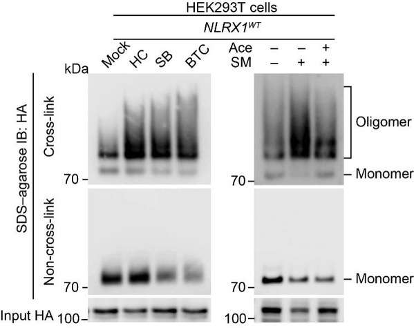 胞质乙酰辅酶A调控NLRX1的寡聚化。表达NLRX1 WT(野生型)的HEK293T细胞经指定条件处理后,将样品分为两份,一份使用戊二醛交联,另一份不交联,随后使用SDS-agarose电泳检测NLRX1的寡聚化水平。