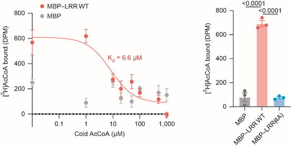 MBP-LRR WT(野生型)与乙酰辅酶A结合Kd值约为6.6 µM。将纯化的重组MBP-LRR WT、MBP-LRR(4A)或MBP蛋白与 2 µM3H标记的乙酰辅酶 A共孵育,通过闪烁计数器检测3H标记的乙酰辅酶 A结合情况。