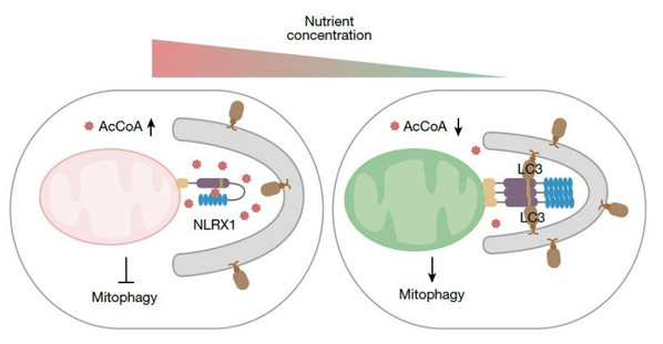 细胞质乙酰辅酶A调控NLRX1的寡聚化和下游LC3自噬小体的招募。在营养充足时,高水平的乙酰辅酶A结合NLRX1的LRR结构域,增强其与NACHT的相互作用,从而掩蔽LIR基序,抑制线粒体自噬。而在饥饿条件下,乙酰辅酶A水平下降,其与NLRX1解离使LIR基序暴露,促进NLRX1寡聚化及与LC3结合,激活线粒体自噬。