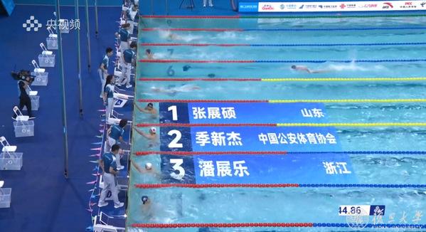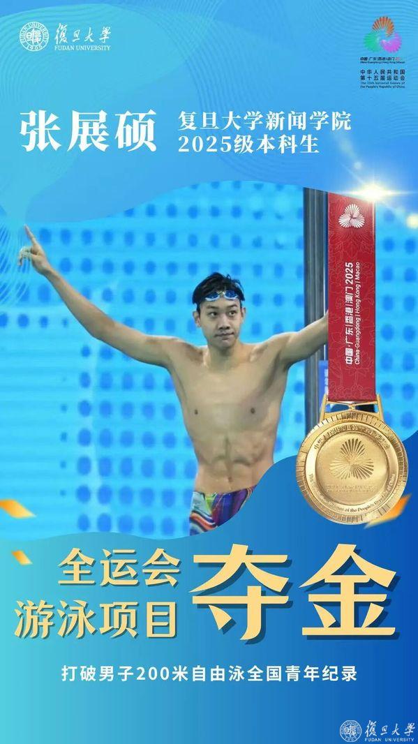 在第十五届全国运动会男子200米自由泳决赛中,复旦大学新闻学院本科生张展硕发挥出色,以1分44秒86的优异成绩勇夺金牌,并打破该项目的全国青年纪录。此前半决赛中,张展硕就展现出强劲实力游出1分46秒89,位列所有选手的第一位。当晚的决赛中,他不仅延续了良好状态,更实现了对自我成绩的突破。