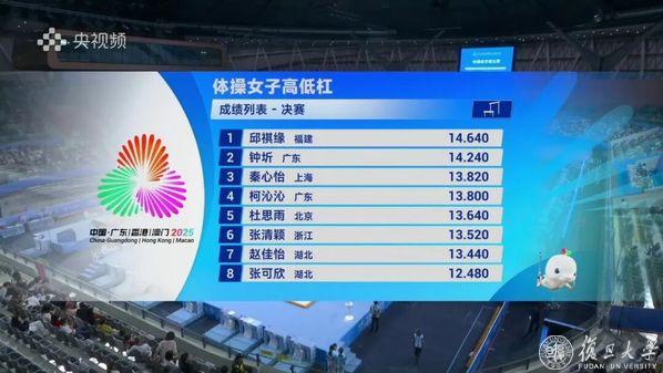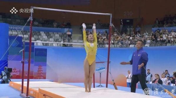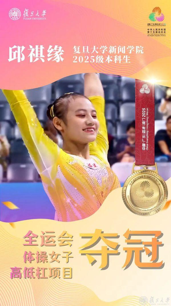 在第十五届全国运动会体操项目女子高低杠决赛中,复旦大学新闻学院2025级本科生邱祺缘以14.640分的优异成绩摘得金牌!祝贺邱祺缘!