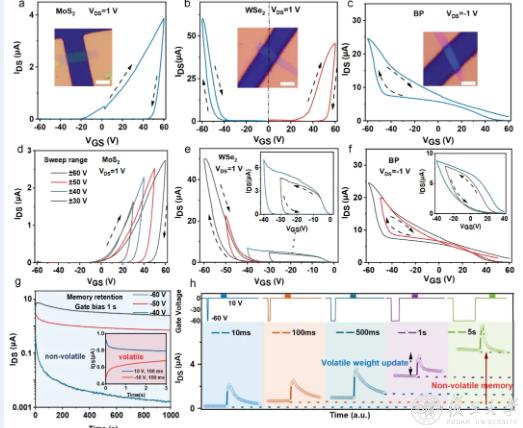该研究通过TCAD数值模拟系统揭示了铁电极化(FE)与电荷俘获(CT)在铁电晶体管中共存与竞争的机理:在n型二硫化钼的沟道中,电子多数载流子增强俘获效应,形成反向去极化场,导致铁电极化被抑制,晶体管的转移曲线呈现CT主导的顺时针迟滞方向;在p型黑磷沟道中,载流子以空穴为主,俘获效应减弱,铁电极化得以实现翻转,晶体管表现出FE主导的顺时针迟滞特征。研究提出的极性依赖的铁电调制机制实现了铁电极化与电荷俘获两种对立物理过程的可控转变。通过在二维铁电杂化钙钛矿中嵌入电子俘获位点并引入不同极性的半导体沟道,器件实现了铁电极化与电荷俘获的异质协同,使器件在非易失与易失功能间自由切换。