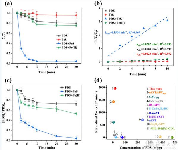 研究开发了一种结构稳定的非均相催化剂FeS,FeS对PDS具有出色的活化能力,可快速去除土壤中的卡马西平,同时具有很强的抗性和良好的pH耐受性。此外,相较于其他活化方式降解土壤中的有机污染物,本研究以较低的氧化剂需求就可达到高效去除土壤中有机污染物的目的。研究结果表明FeS可以有效活化PDS降解土壤中的CBZ,且反应过程中对土壤pH影响较小,在不同类型的土壤中均具有良好的抗性和催化稳定性。FeS/PDS体系能够连续生成表面结合的SO4•−和1O2,激光闪光光解和荧光光谱证实了表面结合的SO4•−比游离SO4•−具有更长的寿命。这种非均相表面氧化能够将反应活性物种定位在污染物附近,减少迁移距离,并抑制ROS的自淬灭。同时FeS/PDS体系是一个温和的氧化工艺,对土壤基质的影响几乎可以忽略不计。