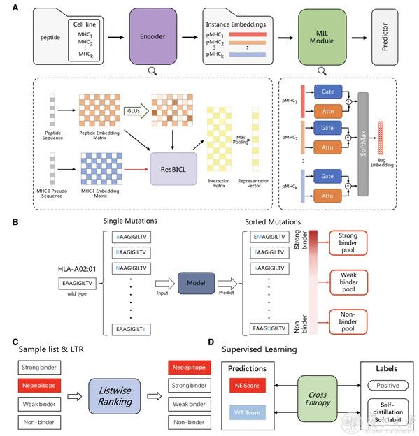 NeoMHCI使用多示例学习生成具有多个MHC-I类分子的高质量肽嵌入,并增加排序损失进行多任务微调,进一步提高免疫原性肽段的识别优先级。通过全面的基准测试,NeoMHCI在未见的多等位基因配体呈递预测中实现0.948的AUC和0.496的AUPR精度,并在新表位识别中实现最高的top-5准确率(42.3%)。