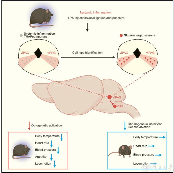 研究团队以脂多糖和盲肠结扎穿孔术诱导系统性炎症的小鼠模型为基础,运用TRAP标记、光遗传学激活、化学遗传学抑制、环路示踪及电生理记录等手段,证实在急性炎症期间,vlPAG的谷氨酸能神经元被显著激活,并通过向延髓NTS脑区投射,驱动低体温、心血管功能抑制以及活动减少的典型低代谢表型。进一步的功能实验表明,抑制这一通路的活动水平能有效缓解炎症导致的低代谢状态,而在非炎症状态下激活该环路则可重现低代谢症状。