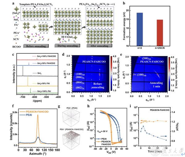 10月28日,未来信息创新学院褚君浩院士、李文武教授团队提出一种调控准二维锡基钙钛矿中不同n值相顺序生长的有效策略。通过在前驱体中引入硫氰酸苯乙铵,在室温下诱导形成高质量的PEA2FAn-1SnnI3n-1SCN2(n=2)模板,用甲酸甲脒和碘化铵替代碘化甲脒,抑制3D FASnI3相的无序生长,实现薄膜的精准结晶控制,获得低缺陷、高取向的高质量锡基钙钛矿薄膜。