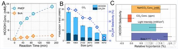 图(A) PMEF与体相反应对比;图(B) 不同尺寸的PMEF主要产物和选择性;图(C) 产物选择性主导作用的各因素计算结果