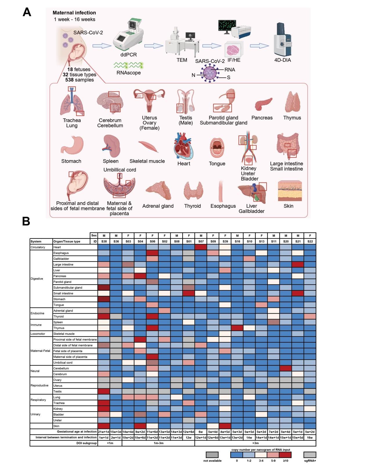 该研究对18例母体孕期感染过SARS-CoV-2后因各种原因在孕中期终止妊娠的胎儿进行了系统性的尸检分析。研究人员收集了32种不同脏器类型共计538份样本,运用ddPCR、RNAscope、透射电镜等先进的分子生物学技术,以前所未有的广度与精度,探寻并量化了病毒在胎儿全身的分布和复制情况。