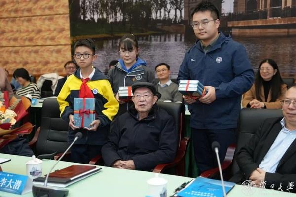 活动现场,李大潜向复旦大学图书馆、档案馆、数学科学学院、复旦附中、复旦二附校和永平县等赠书