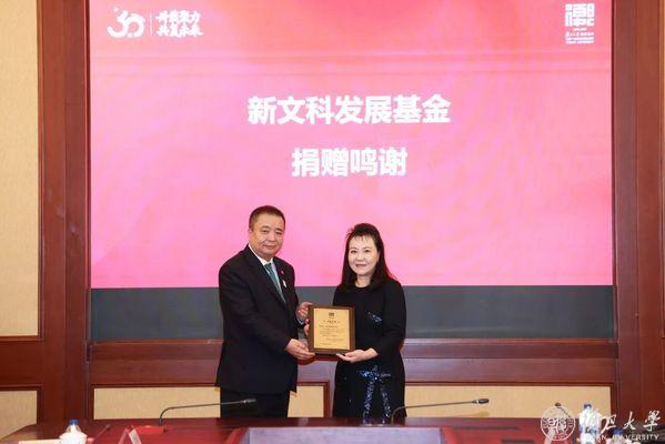 捐赠签约仪式现场,百廿之际由校董王长田及校董伉俪屠宁康、曹国伟联合捐赠设立的新文科发展基金完成实质落地签约。金力先后向李大鹏、谢吉人校董企业正大集团、蔡彤、袁蕙华、朱义、王长田、屠宁康、李多珠等校董或校董企业代表颁发捐赠鸣谢牌。