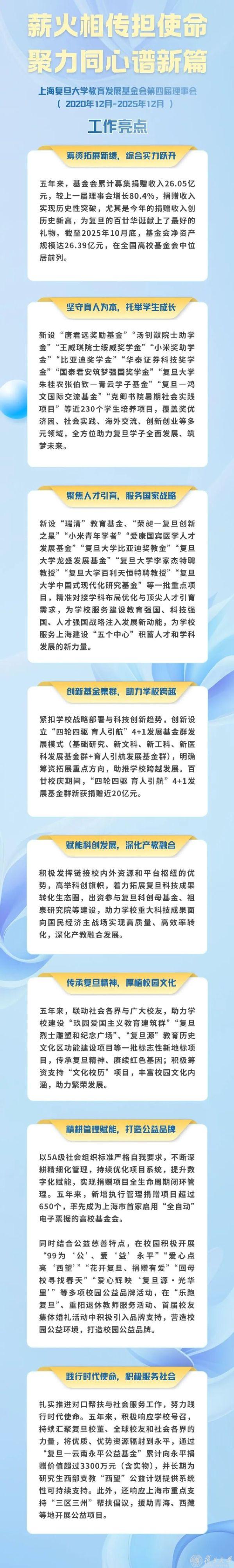 在随后举行的第五届理事会第一次会议上,新一届理事会负责人选举产生,裘新当选理事长,金海燕当选副理事长,复旦大学对外联络与发展处处长刘莉当选秘书长。会议审议副秘书长人选建议名单,听取并审议基金会2026年工作计划、2026年预算方案。