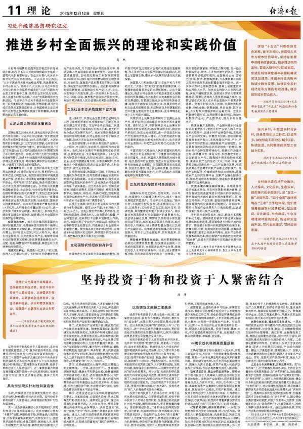 乡村是与城镇形态迥异但功能互补的地域综合体,城乡关系从二元结构转向融合发展是一国现代化的重要标志。农业农村现代化关系中国式现代化全局和成色。习近平总书记指出,“从中华民族伟大复兴战略全局看,民族要复兴,乡村必振兴”。党的十八大以来,以习近平同志为核心的党中央坚持把解决好“三农”问题作为全党工作的重中之重,坚持农业农村优先发展,深入实施乡村振兴战略,“三农”发展取得历史性新成就。习近平总书记关于推进乡村全面振兴的一系列重要论述,内涵丰富、思想深邃,是习近平经济思想的重要组成部分,为我国推进农业农村现代化和农业强国建设提供了根本遵循,具有重要的理论和实践价值。