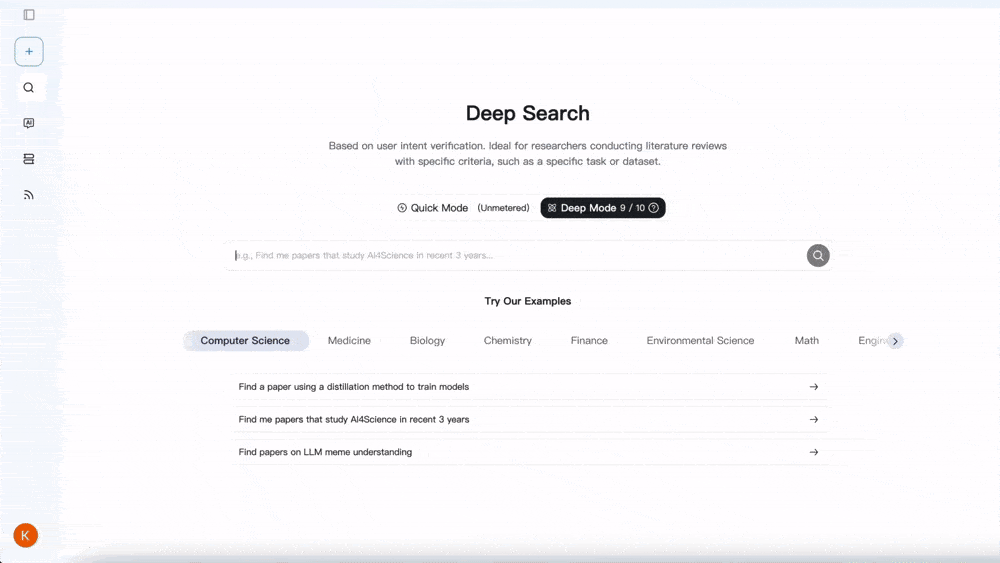 深度搜索不只是找论文,更是筛论文。它将自主过滤掉大量“看似有用实则无关”的文献,将真正相关的论文送到你的眼前。