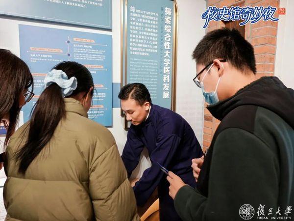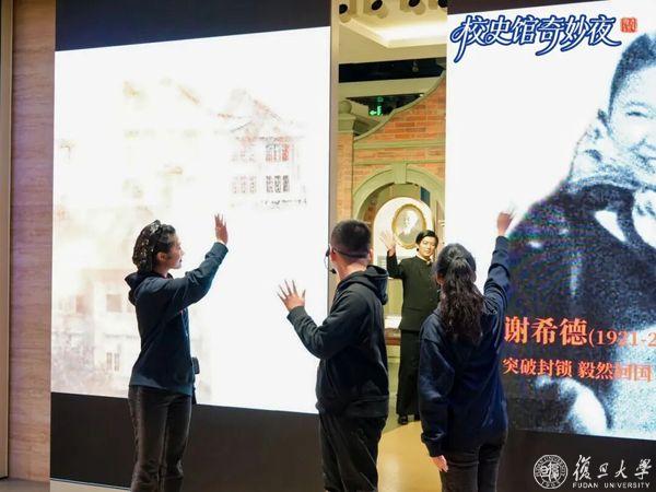 陈望道先生的互动点前,学生们讲述着“真理的味道是甜的”这一典故。谢希德先生和颜福庆先生的互动区同样人气高涨,问答声、脚步声、交流讨论声交织在一起。