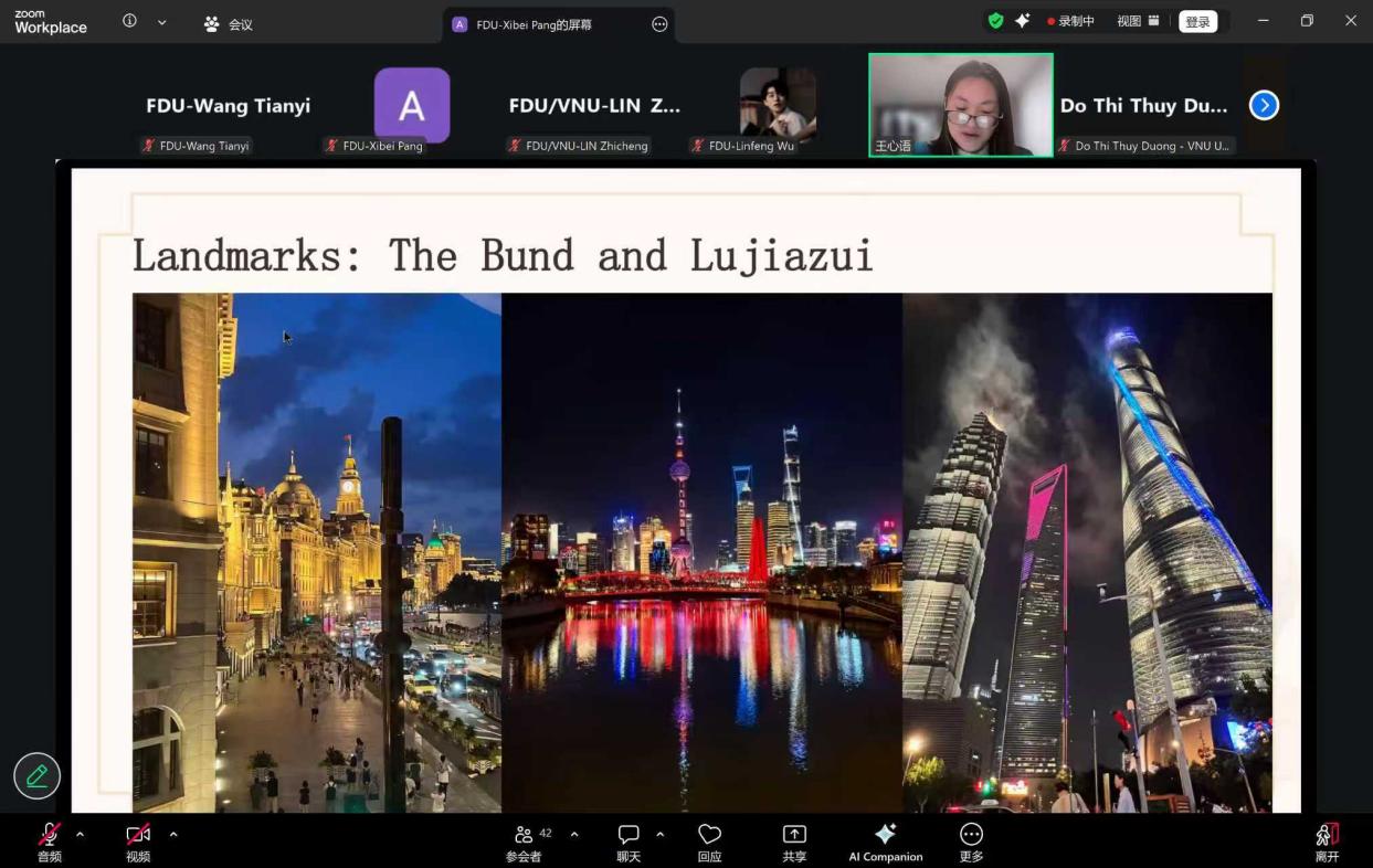 复旦大学2023级政治学、哲学与经济学专业本科生王心语分享了上海“海纳百川”的城市精神,以小笼包、外滩等特色元素串联起在沪求学感悟,回顾了以大白兔糖开启跨文化互动、与越南队友协作优化湄公河地区电商教育项目的参赛经历。