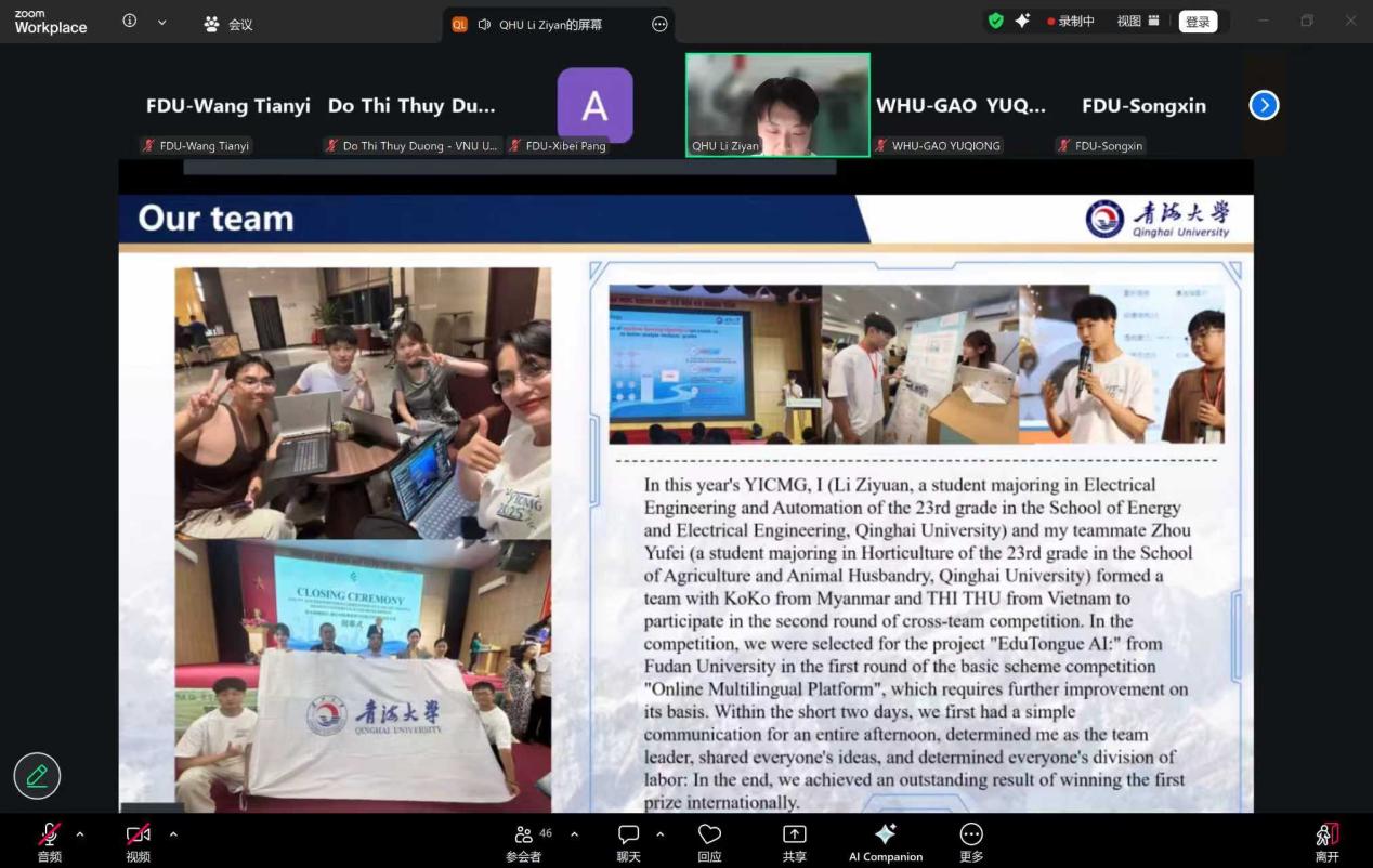 青海大学李姿言是第九届澜湄青创赛“最有创意团队”奖、“最佳跨国团队”奖获奖代表。他详细介绍了青海“中华水塔”的地理特质与多民族共居的文化多样性,分享了结合缅甸听障群体需求、融入计算机视觉技术优化的项目设计与参赛经历。