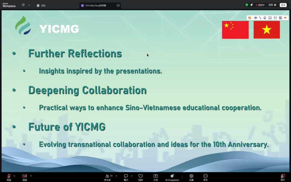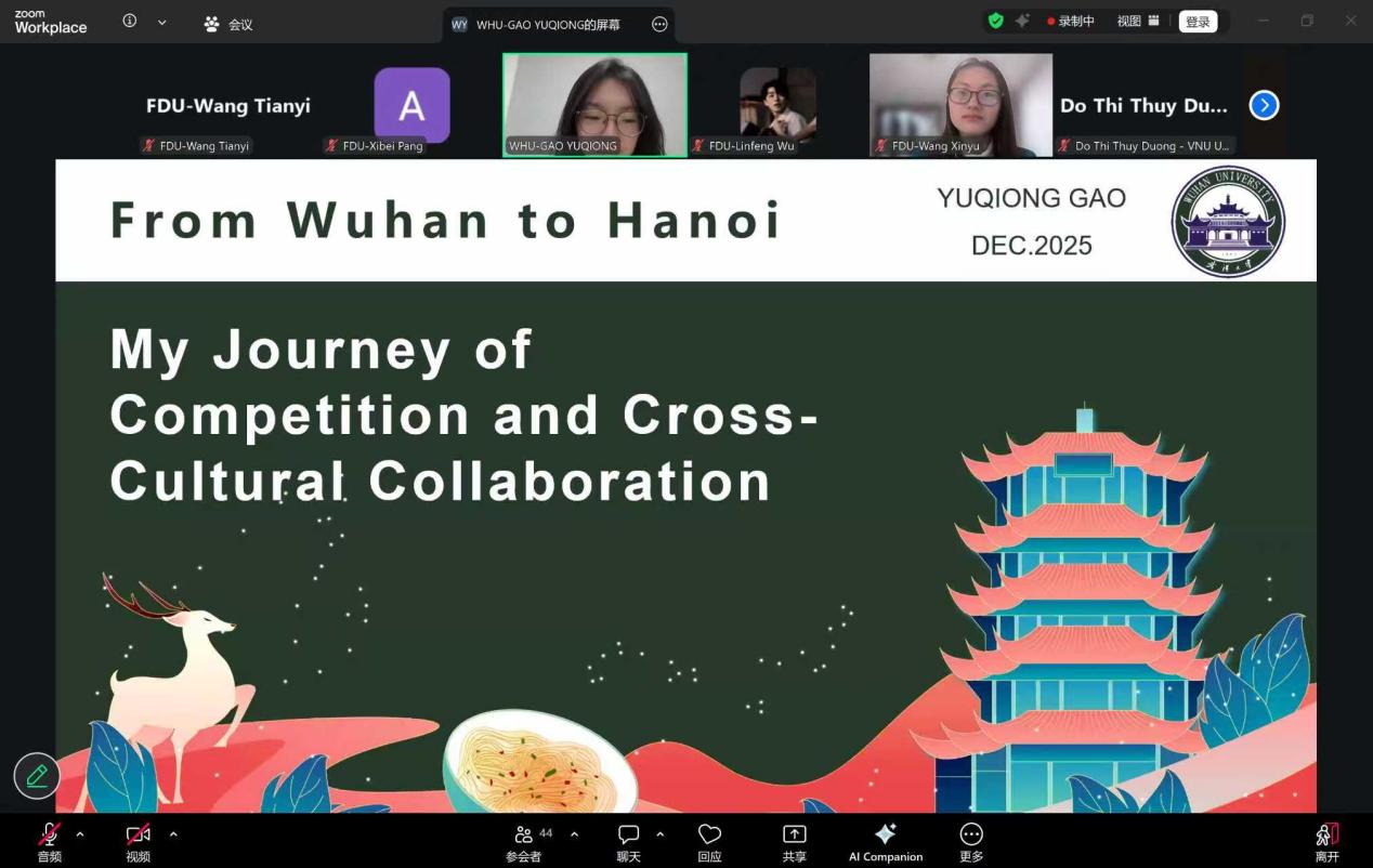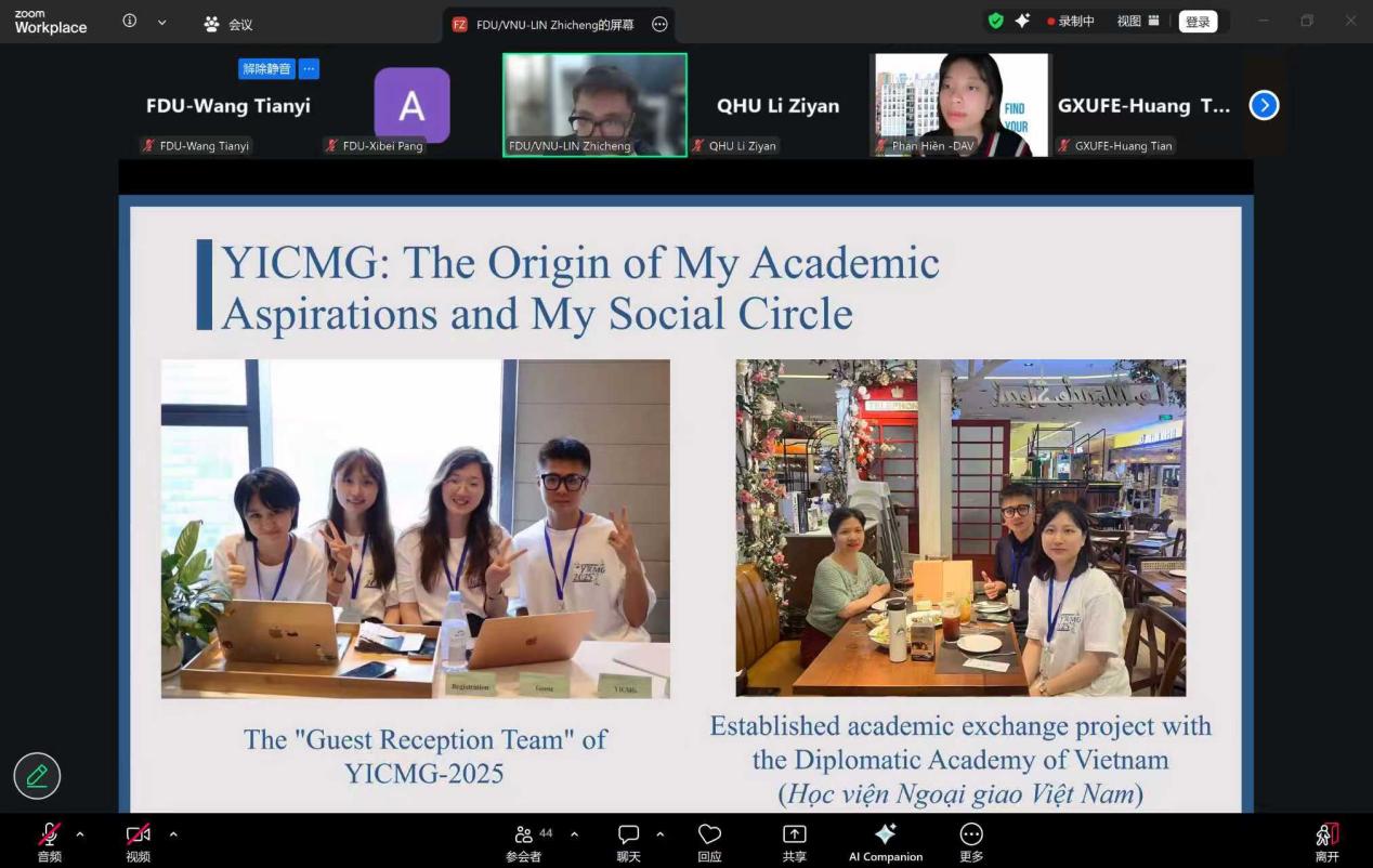 12月23日,复旦大学国际关系与公共事务学院、第十届澜沧江-湄公河流域治理与发展青年创新设计大赛(Youth Innovation Competition on Lancang- Mekong Region's Governance and Development,简称澜湄青创赛)组委会举办中越青年对话,来自复旦大学、武汉大学、青海大学、广西财经学院与越南河内国家大学所属人文社科大学、越南外交学院等6所高校的46名中越青年代表齐聚云端,共同分享在中越人文交流年的收获,畅想未来以友谊为纽带的中越青年交流合作新图景。活动由第十届澜湄青创赛筹备组学生志愿者庞曦贝主持。