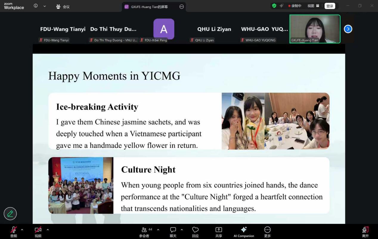 活动最后,中越青年代表们纷纷表示,今年在各种场合见面、今天线上对话活动的场景仍历历在目,期待未来能够再次聚首,深化交流、加深友谊,大家也将以此次对话为新的起点,持续加强语言互学、文化互鉴、成长互助,依托澜湄青创赛平台,同时在更为广阔的交往实践中,以青春之力推动中越青年深化互信、共谋发展,为构建更加紧密的中越命运共同体注入源源不断的青春活力。
