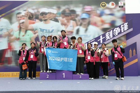 上海十公里精英赛后,蒋俊琦与参与急救工作的班级学生合影