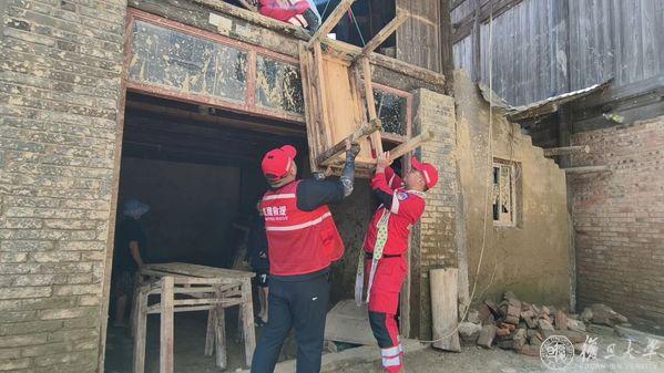 救援队协助杨家湾村受灾老人清理受灾房屋