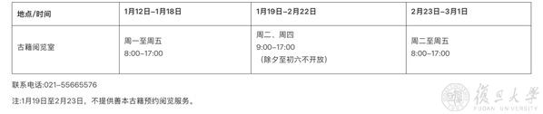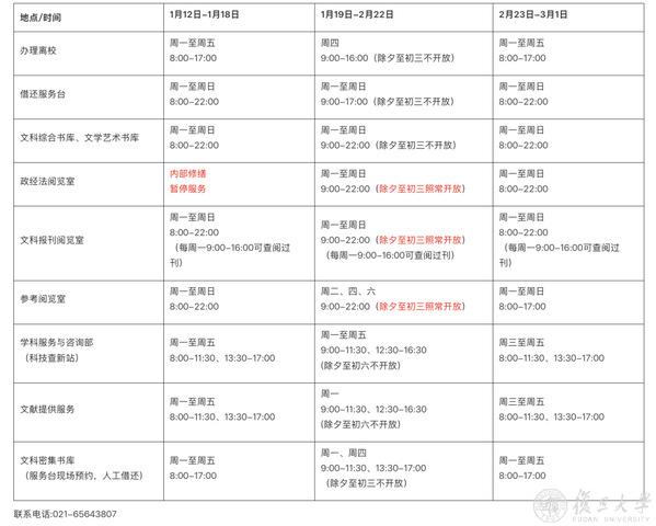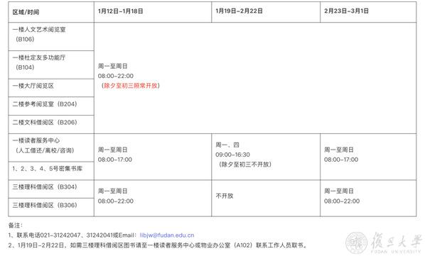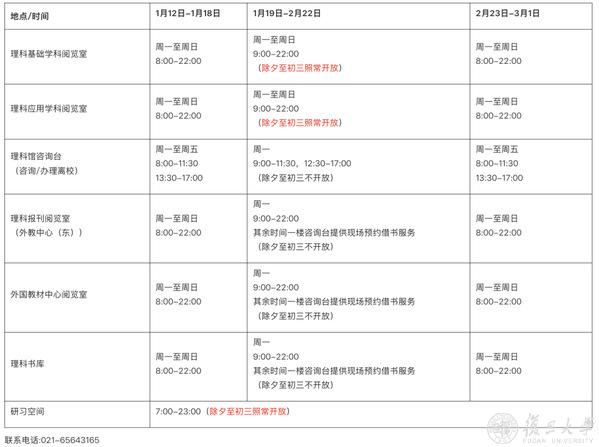 寒假期间,各馆具体开放时间请见附表所示。若在相关阅览室关闭期间需要使用其中书刊资料,请提前和值班老师联系,联系方式详见图书馆主页。同时,馆际互借服务暂停。若有特殊需求,读者可提出申请,经核准后作个别处理。