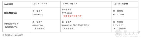 1月11日至2月23日开放第二教学楼二楼,开放时间为8:00-22:30。