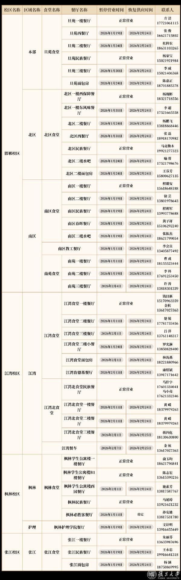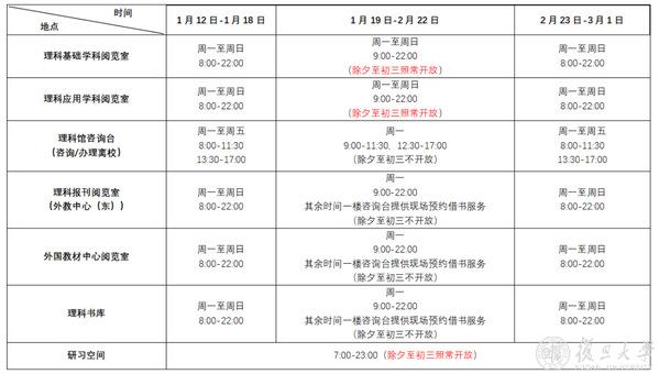 寒假春节期间,“复旦源”各场馆假期安排如下: