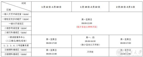 1月11日至2月23日开放第二教学楼二楼,开放时间为8:00-22:30。