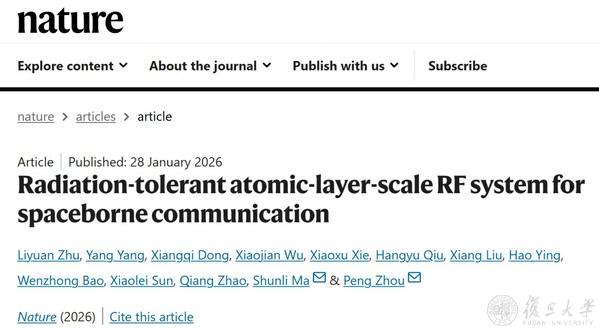 复旦大学集成芯片与系统全国重点实验室集成电路与微纳电子创新学院周鹏、马顺利研究团队研制“青鸟”原子层半导体抗辐射射频通信系统,依托“复旦一号”(澜湄未来星)卫星平台,在国际上首次实现基于二维电子器件与系统的在轨验证,开辟了原子层半导体太空电子学领域标志着人类向构建高可靠、轻量化太空电子系统迈出关键一步。相关成果于北京时间1月29日凌晨发表于《自然》(Nature)。