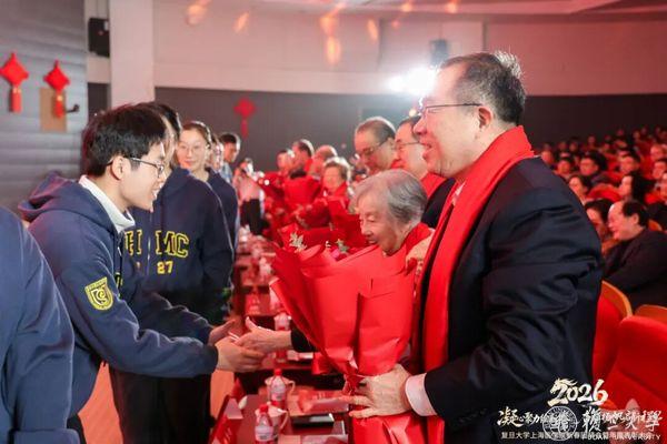 校党委书记裘新,校长、上海医学院院长金力和上海医学院党政领导,老领导代表,各院所平台、附属医院、学校及医学院职能部门负责人,师生医护员工代表,后勤保障员工代表,支持复旦上医发展的各界人士等欢聚一堂,以团拜之礼凝聚共识、表彰先进、昂扬斗志。