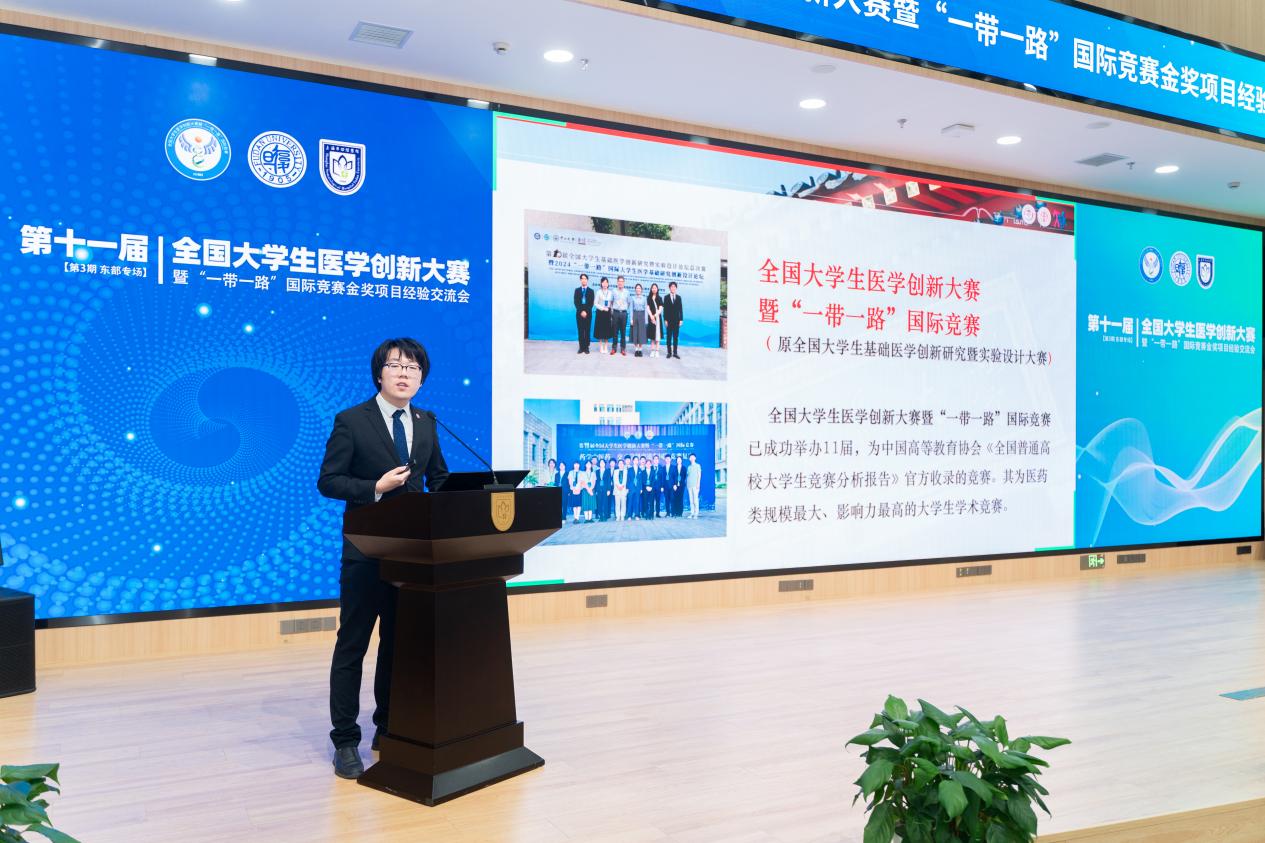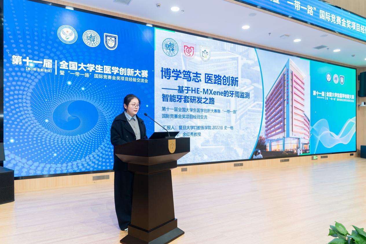 在随后进行的金奖项目经验分享环节中,来自不同赛道、多所高校的优秀学子及导师代表依次发言。口腔医院的李可为、史一格,上海交通大学的曹宸语,同济大学的方可,海军军医大学的唐旭东,以及来自中国药科大学、南京中医药大学、浙江大学、南京医科大学、扬州大学的杜佳豪、于添翼、徐鑫杰、高畅、吴丹妮等同学,分别围绕各自获奖项目进行汇报。