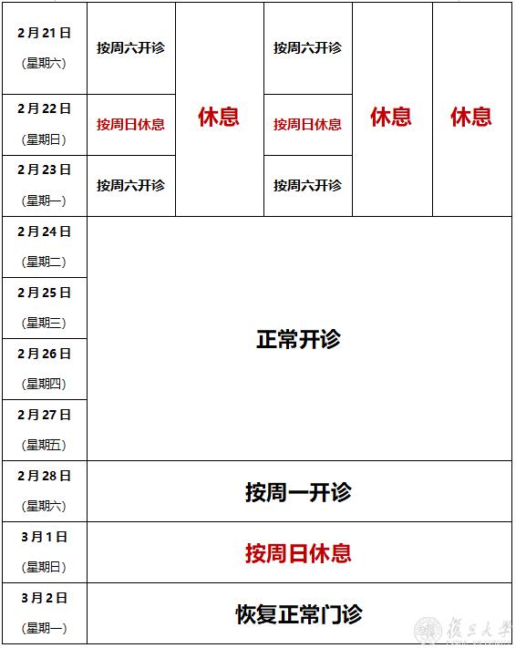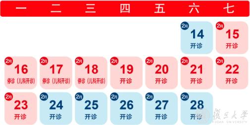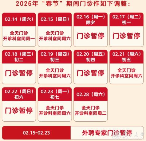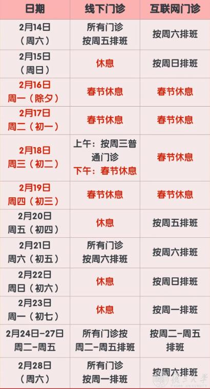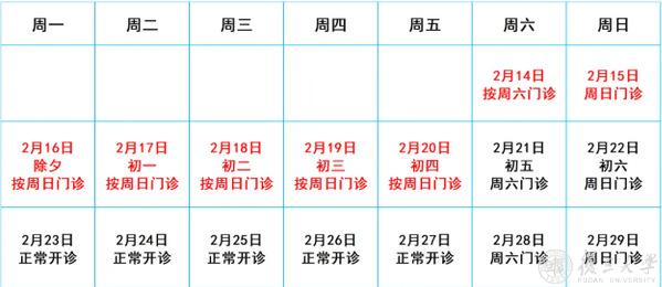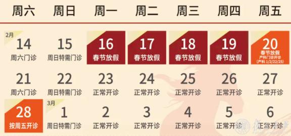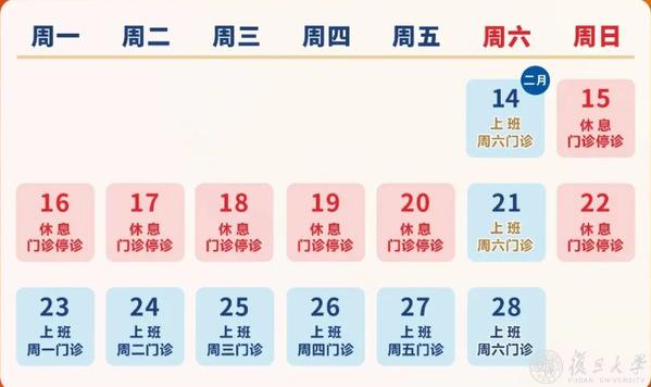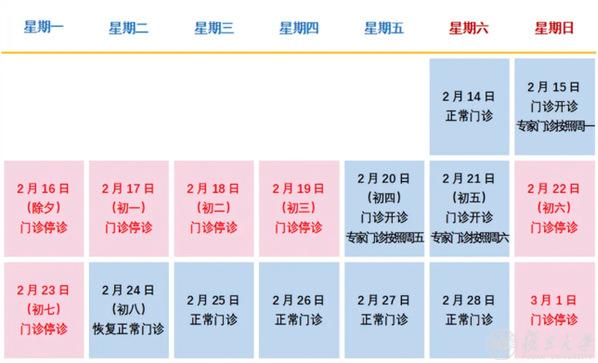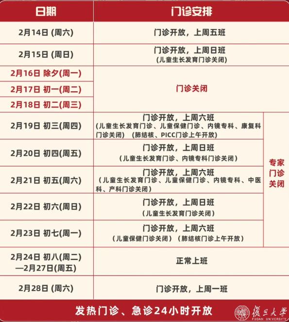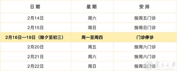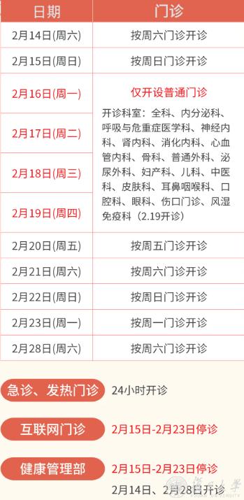 2月16日(除夕)、2月17日(初一)、2月18日(初二)、2月19日(初三)节假日门诊停诊,金山院区急诊、发热门诊照常。