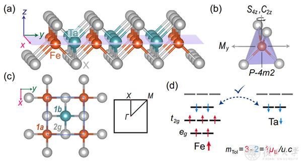 图 (a,c)单层FeTaX2体系的结构;(b) 主要对称性;(d) 晶格场劈裂与电子填充