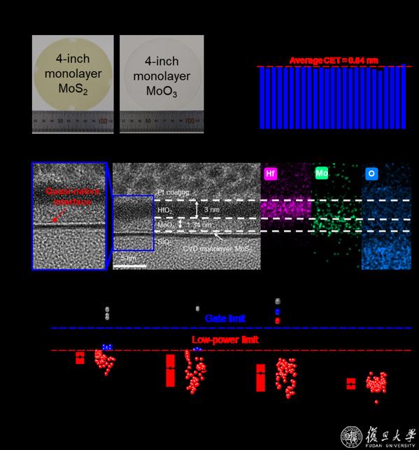 图(a)晶圆级单层MoS2向MoO3转化的光学图片;(b)单层MoO3的CET统计数据;(c)单层MoO3与超薄HfO2集成的TEM图;(d)不同CET下MoO3/HfO2叠层的漏电流密度统计。