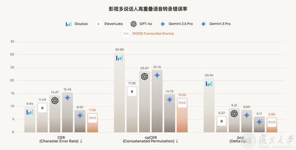 图 影视剧背景下该模型实现了最低的 CER(字错误率)与 cpCER(最优排列字错误率)、最佳的 Δcp 指标(说话人分离性能)