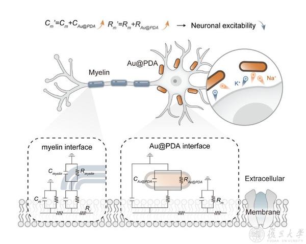 研究人员巧妙设计了Au@PDA纳米棒作为“膜结构编辑工具”,该特殊结构可利用化学键紧密贴合在神经元膜表面,形成稳定的拓扑复合界面,相当于在神经元电路中“嵌入”耦合电容和串联电阻,显著改变膜的电学特性,并诱导神经元发生与可塑性相关的适应性调整,从物理层面持续降低神经元的兴奋性。该技术在动物模型中展现出显著的治疗潜力。这项创新工作不仅验证了通过拓扑界面工程直接“物理重编码”神经信号的可行性,更提供了神经调控策略从 “离子通道靶向” 迈向 “膜结构工程” 拓展的新维度,为发展新一代神经调控工具、高性能脑机接口及神经疾病治疗技术开辟了全新的物理干预路径。