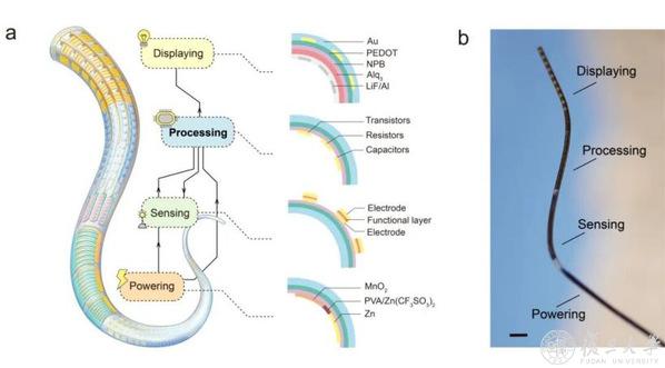 长期以来,纤维系统的集成普遍依赖连接硬质芯片电路板,穿戴舒适性差、连接不稳定、体内植入安全性风险大。针对这一科学问题,复旦大学纤维电子材料与器件研究院、高分子科学系、先进材料实验室、聚合物分子工程全国重点实验室彭慧胜、陈培宁团队突破传统芯片硅基研究范式率先提出并制备“纤维芯片”。在弹性的高分子纤维内实现大规模集成电路,成功将供电、传感、显示、信号处理等多功能集成于一根纤维之内,为纤维电子系统开辟全新的集成路径。该成果以“Fibre integrated circuits by multilayered spiral architecture”为题,于1月22日发表于Nature。