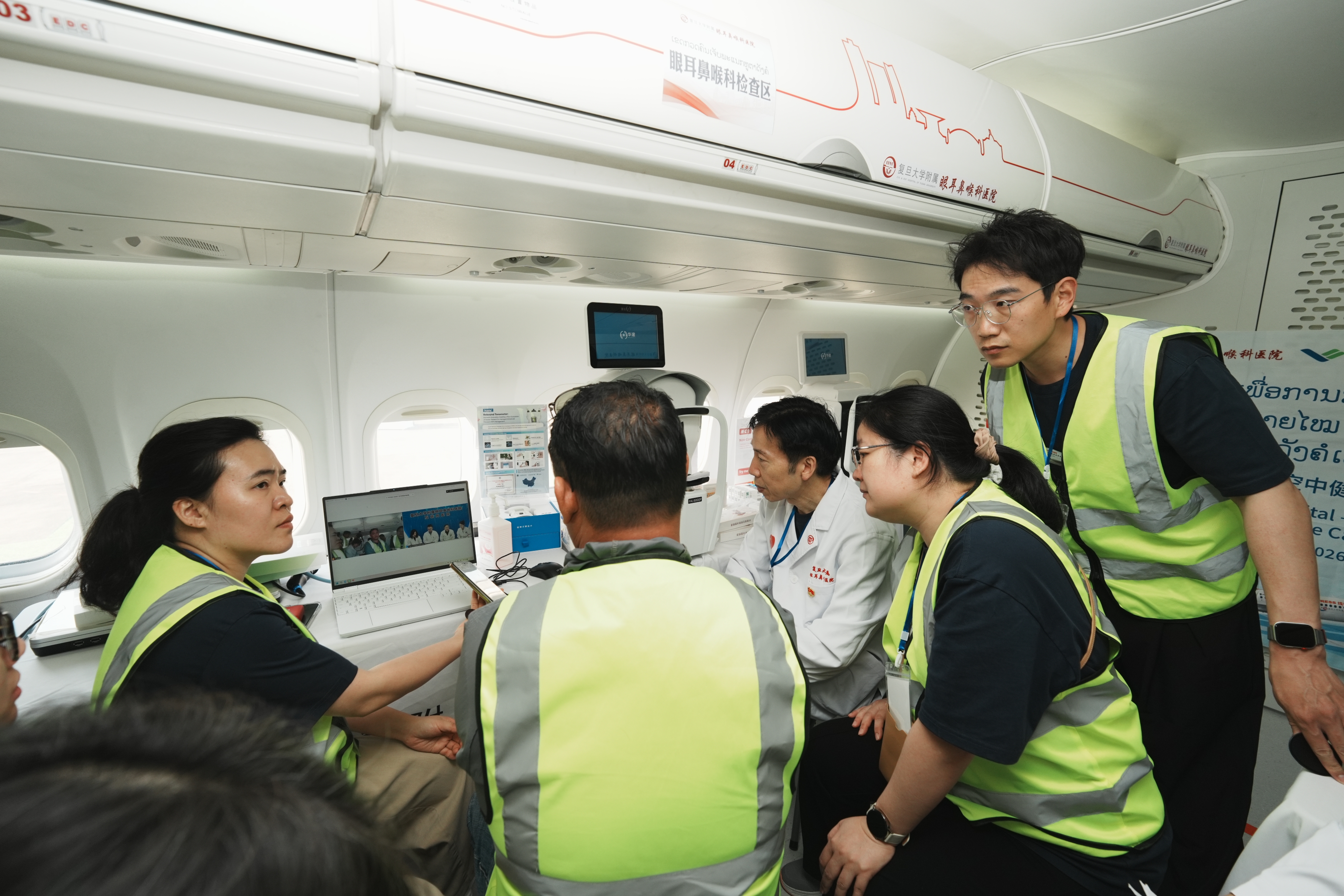 这架配备先进眼科手术显微镜、耳鼻喉内窥镜系统、数字化诊疗设备的飞机,在万象瓦岱国际机场与玛霍索综合医院之间搭建起空中五官健康桥梁。医护团队在义诊筛查出的疑难病例被转入飞机医院进行深度检查、MDT会诊或手术,在飞机医院百级层流洁净手术舱,周行涛带领团队完成首批海外眼科手术,同时飞机上搭载的高端设备也用于当地医院联合门诊。