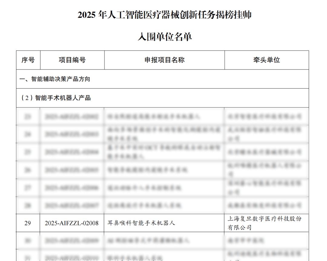 近日,国家工业和信息化部、国家药品监督管理局联合公布2025年人工智能医疗器械创新任务揭榜挂帅项目入围名单。复旦大学基础医学院数字医学研究中心的产业化基地上海复旦数字医疗科技股份有限公司自主研发的“耳鼻喉科智能手术机器人”成功入选。